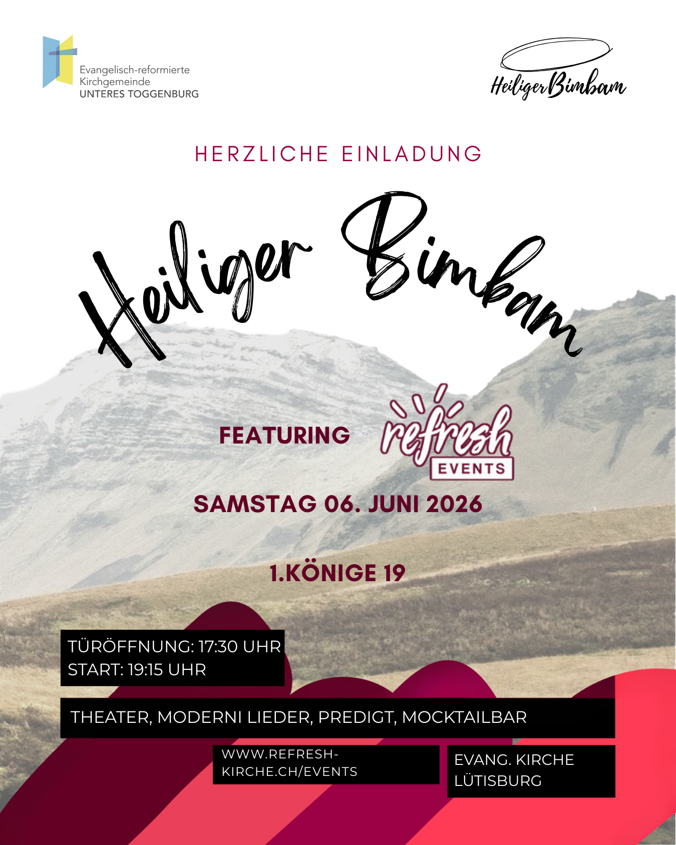 Dieser Heilige Bimbam wird einmalig: wir feiern den Jugendgottesdienst gemeinsam mit anderen Jugendlichen aus der Region (https://refresh-kirche.ch/). Herzliche Einladung!